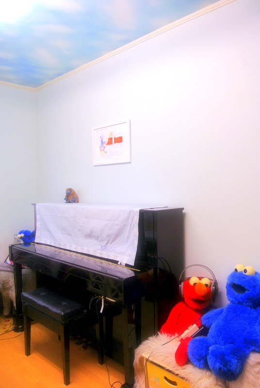練習室(レッスン室となりのアップライトピアノ部屋)は、以前はローラ・アシュレイの縦細縞でしたが、水色系という点だけを新壁紙に受け継ぐことにし、天井は空に見立てました。